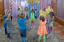 Музыка эшчәнлегендә балалар "Күбәләкләр" музыкаль уенын бик яратып уйныйлар.Уен вакытында хәрәкәт активлыгынын, төсләрне аера белүләрен ныгытабыз.Музыка җитәкчесе Васильева И.Т. 07.05.2015