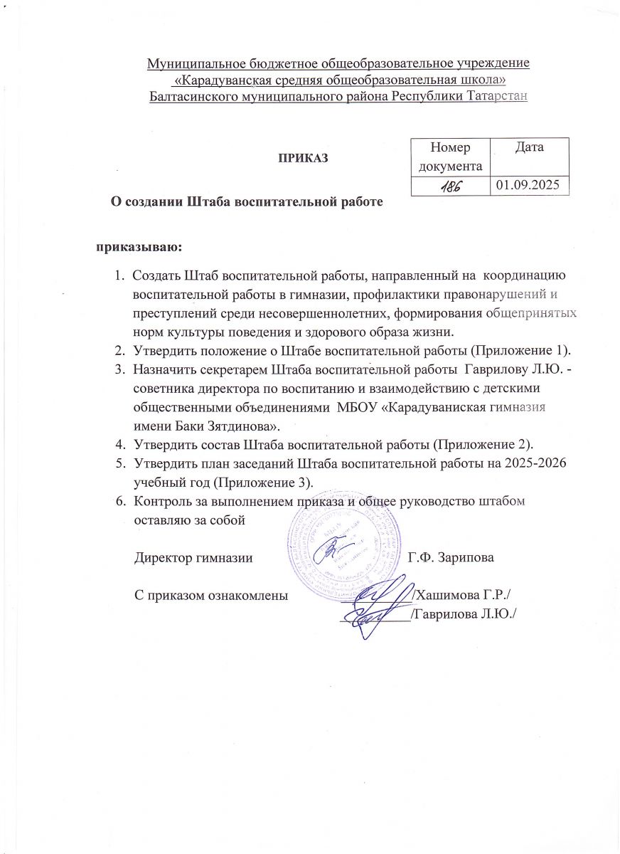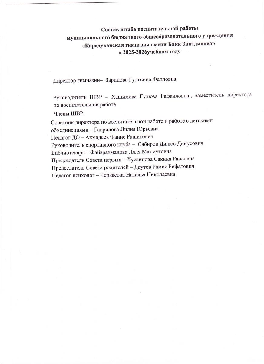 Муниципальное бюджетное общеобразовательное учреждение «Карадуванская гимназия имени Баки Зиятдинова» Балтасинского муниципального района Республики Татарстан / Татарстан Республикасы Балтач муниципаль районы муниципаль бюджет гомуми белем учреждениесе «Бакый Зыятдинов исемендәге Карадуган гимназиясе».