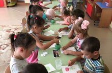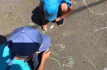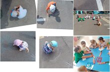Сегодня с детьми рисовали на асфальте солнышко, а с помощью трафаретов овощи./ Бүген балалар белән асфальтта кояш ясадык, трафаретлар ядәмендә яшелчәләр./ Творчестволы сизем арняе покчи группаысь пиналъëс асфальт вылын шунды суредазы, нош группаын трафаретэн суредаса бакча емышъëсты буязы.
