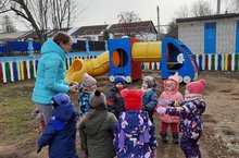 Дети младшей группы на прогулке играют в игру "Поймай мячик"/ Кэчкенэлэр торкемендэ прогулка вакытында балалар белэн "Тупны тот" уенын уйнадык/ "Тупес кутыса" шудон.