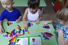 Дети средней группы при помощи "Построй лесенку" закрепляют умение считать в прямом и обратном порядке, развивают глазомер/Уртанчылар торкеме балалары "Баскыч тозе" уены аша санау кунекмэлэрен ныгыталар/Кюзенер лыдзон матерьялэн шудон/