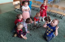 Дети группы раннего возраста играют в игру "Собери шишки". Знакомятся со свойствами шишки: большая, маленькая, колючая.
