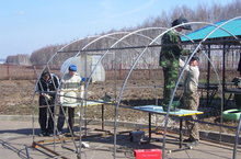 В целях благоустройства пришкольного участка учителя нашей школы Загидуллин Н.Н, Зайнетдинов Р.И, тренер Григорьев С.А ,под руководством директора Исмагилова М.Ф , начали строить теплицу. Работа идёт быстро, каркас теплицы уже готов. Наши учителя-мужчины –мастера на все руки!