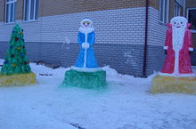 Учащиеся 8 класса совместно с родителями слепили возле школы снежные фигуры. Получились ракета и домик-часы. Мамы и папы смастерили большую снежную горку для малышей.