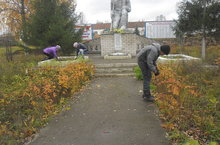 Уход за памятником павшим воинам в годы Великой Отечественной войны - предмет постоянной заботы школьников. Ежегодно каждый класс по графику принимает эстафету. Работы хватает круглый год. Весной уборка территории и посадка цветов, летом необходима прополка цветников и выкашивание травы на всей территории, осенью вновь уборка остатков растительности, а зимой расчистка дорожек от снега. Учащиеся 8 класса (кл.рук. Медведева Н.Н и учитель математики Медведева Н.П) отлично справились с работой, очистили территорию памятника от сухой травы, подрезали кустарники