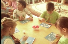 "Кышлаучы кошлар" проекты нигезендә II кечкенәләр төркеме ябыштыру шөгылендә Песнәкне ясыйлар. Балалар кышлаучы кошларның исемнәрен өйрәнәләр. Кошларга җимлекләр кирәклеген аңлыйлар.