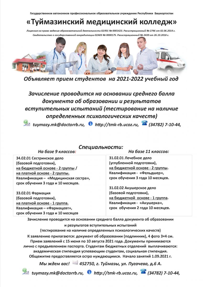 Туймазинский медицинский колледж объявляет прием студентов на 2021-2022 учебный год