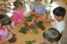 Дети подготовительной группы набрали много листьев на прогулке и решили сделать из них разноцветные гирлянды, добавив в них бусинки.