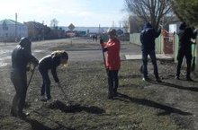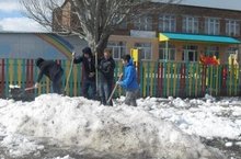 Учащиеся и учителя вышли на субботник. Раскидывали остатки снега и собирали мусор.