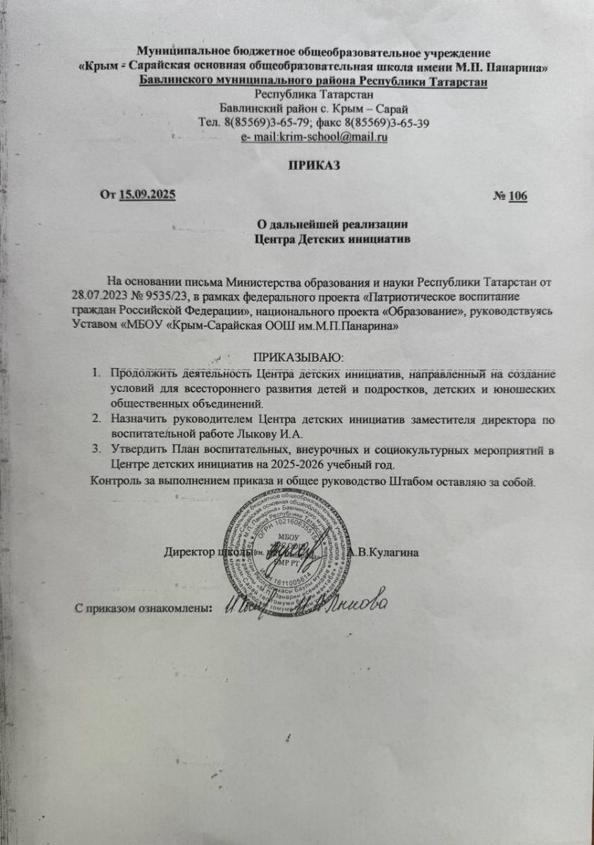 Приказ О дальнейшей реализации Центра Детских инициатив
