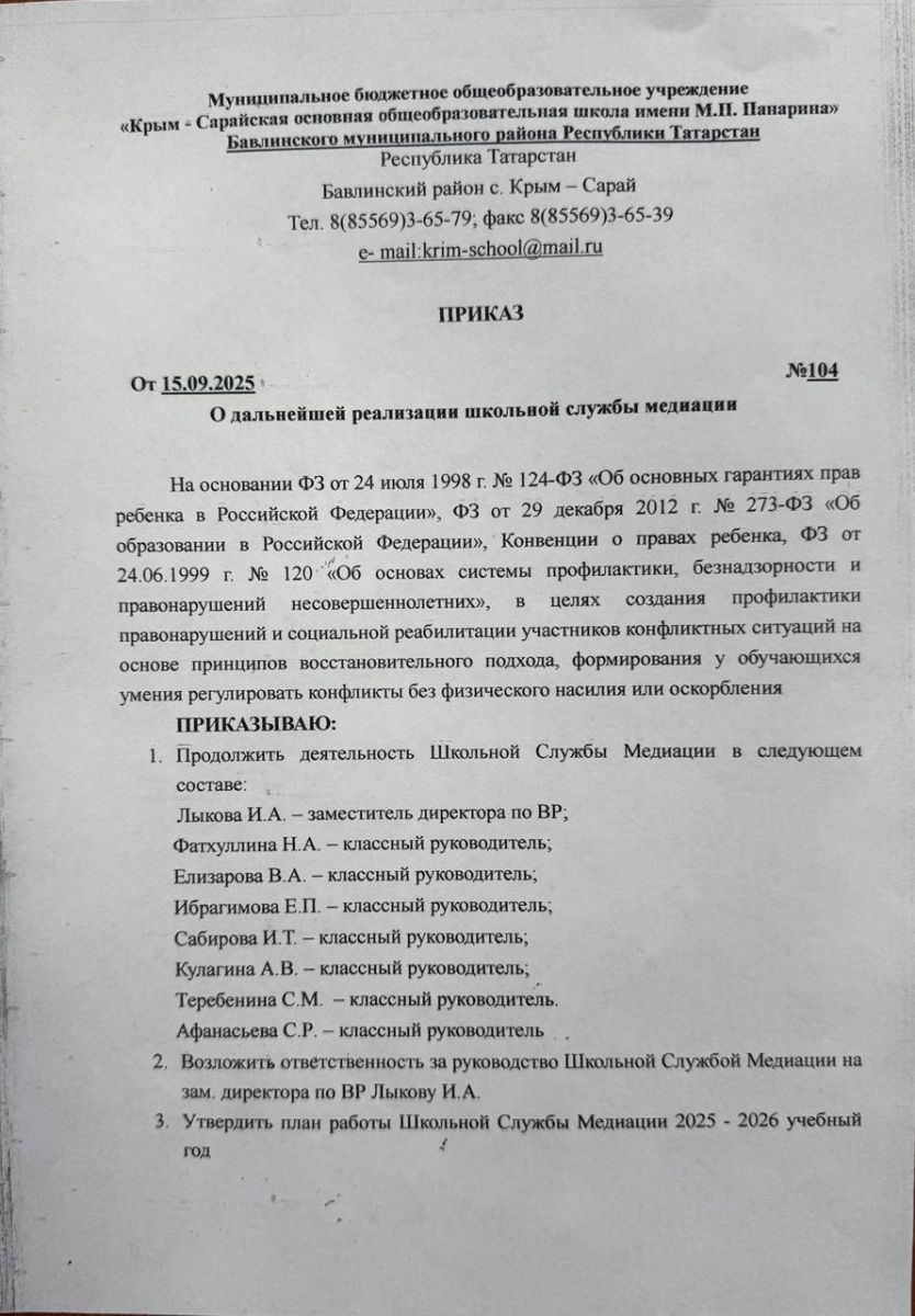 Приказ О дальнейшей реализации школьной службы медиации