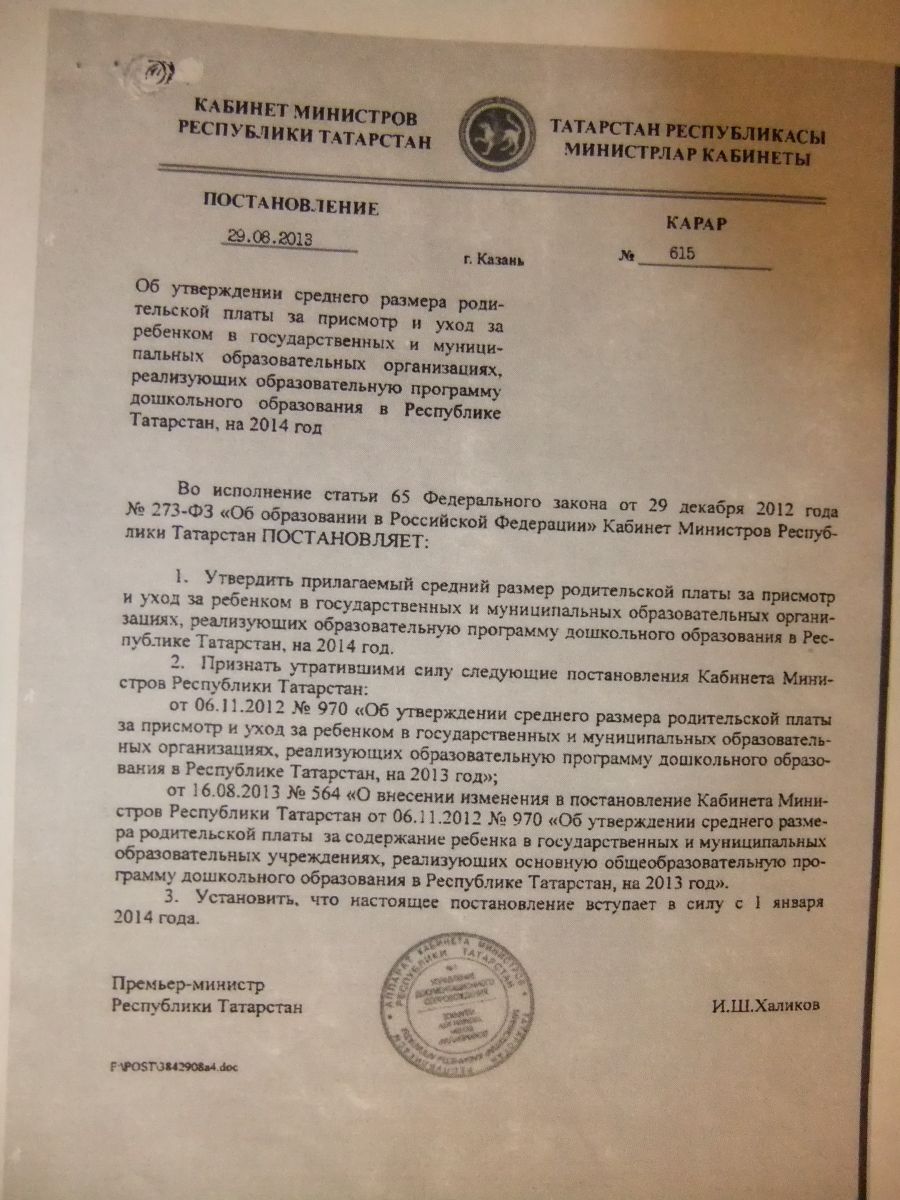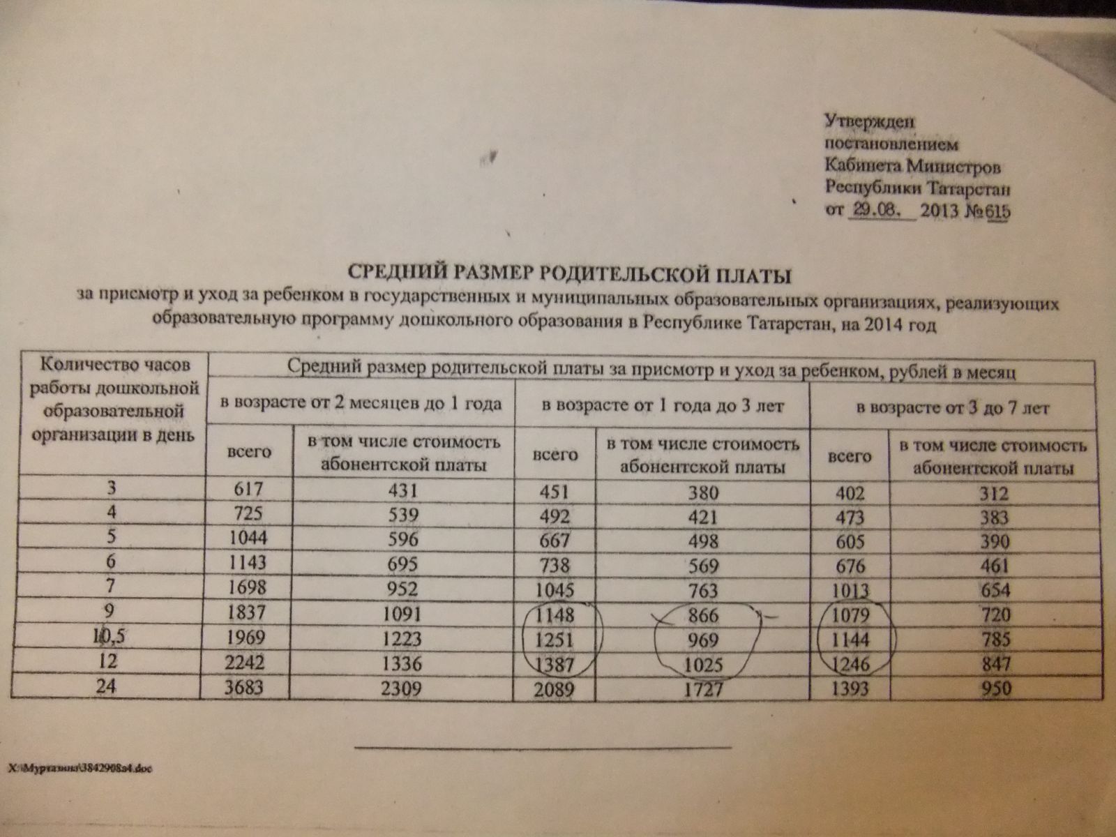 Средний размер родительской платы (утв от 29.08.2013г.№615)