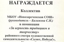 Завершился районный смотр художественной самодеятельности «Салют, Победа!» среди школьников, посвящённый 70-летию Победы. Лучшие номера вошли в программу гала-концерта, который состоялся в СОШ №7. Наша школа была награждена отделом образования дипломом "За верность традициям и творчеству".