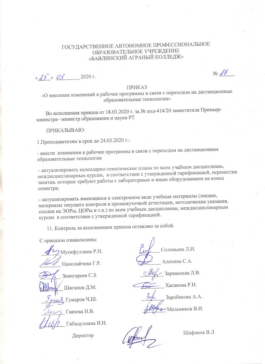 -Приказ о временном переходе на реализацию образовательных программ с применением электронного обучения и дистанционных образовательных технологий в связи с особыми обстоятельствамиАдрес электронной почты ГАПОУ «Бавлинский аграрный колледж» - pl82@bk.ru