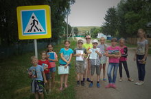 В последний день работы пришкольного лагеря ребята приняли участие во Всероссийской интернет-акции "Безопасность детей на дороге". Они прослушали беседу по правилам дорожного движения, ответили на вопросы мини- теста и сфотографировались на фоне дорожного знака