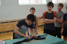 "А ну-ка, мальчики!".Ребята соревновались в ловкости, скорости, меткости, в разборке и сборке автомата. С небольшим перевесом выиграла команда "Партизаны".