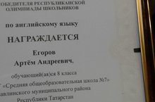 Победитель республиканской олимпиады школьников «Путь к Олимпу» по английскому языку. 28.03.201726 марта в Казани состоялась церемония награждения победителей и призеров республиканской олимпиады школьников «Путь к Олимпу» по английскому языку. Заключительный этап олимпиады прошел с 23 по 26 марта, в нем приняли участие около 200 человек. Шесть из них стали победителями, еще 38 – призерами.Победителем среди 8 классов стал обучающийся МБОУ «Средняя общеобразовательная школа №7» Егоров Артем Андреевич. Руководитель Демидова Надежда Петровна, учитель английского языка и литературы МБОУ «Средняя общеобразовательная школа №7»Итоги олимпиады подвел заместитель Премьер-министра Республики Татарстан – министр образования и науки Энгель Фаттахов на совещании с участием начальников управлений (отделов) образования муниципальных районов и их заместителей по учебно-методической работе.
