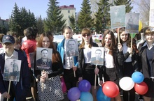 Ученики среднего звена вышли на митинг с портретами своих прадедов, которые участвовали в ВОВ. Возложили гирлянду к памятнику афганцев.