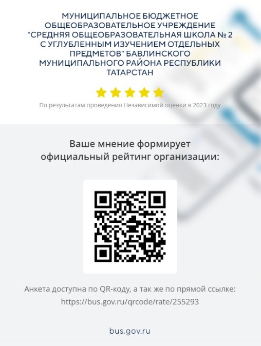 Муниципальное бюджетное общеобразовательное учреждение «Средняя общеобразовательная школа №2 с углубленным изучением отдельных предметов» Бавлинского муниципального района Республики Татарстан, МБОУ "СОШ № 2"/ Татарстан Республикасы Баулы районы муниципаль бюджет гомуми белем учреждениесе « Аерым предметлар тирәнтен өйрәнелә торган 2 нче урта гомуми белем мәктәбе»