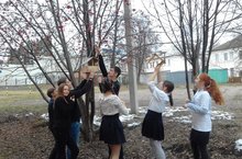 акция 11.11.201711 ноября в рамках Всероссийской акции “Сделано с заботой” активисты РДШ на деревьях школьного сада повесили кормушки для птиц.11 ноябрьдә “Кайгыртучанлык белән эшләнгән” Бөтенроссия акциясе кысасында РДШ активистлары мәктәп бакчасындагы агачларга кошлар өчен җимлекләр элделәр.