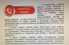 2019 елның 22 мартында 09.00 сәгатьтән 16.00 сәгатькә кадәр Татарстан Республикасында Бала хокуклары буенча вәкаләтле вәкил Аппаратында гаилә иминлегенә, ятим балалар хокукларын саклауга, гаилә низаглары вакытында бала хокукларын саклауга кагылышлы мәсьәләләр буенча "кайнар линия" эше оештырылачак.