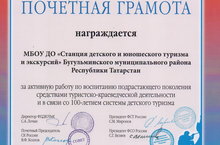 Федеральный центр детско–юношеского туризма и краеведения Федерация спортивного ориентирования России Федерация спортивного туризма России Союз краеведов России наградил МБОУ ДО «Станция детского и юношеского туризма и экскурсий» Почетной грамотой за активную работу по воспитанию подрастающего поколения средствами туристско–краеведческой деятельности и в связи со 100-летием системы детского туризма.