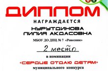 Поздравляем Нурутдинову Лилию Акдасовну, с вручением диплома "Лучший работник сферы воспитания и дополнительного образования" за 2 место в муниципальном конкурсе профессионального мастерства в номинации "Сердце отдаю детям"