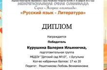 Поздравляем воспитанницу подготовительной группы Курушину Валерию с ПОБЕДОЙ в межрегиональной очной олимпиаде по русскому языку, которую провели в СОШ √6. НОУ ДПО «Центр социально-гуманитарного образования». Наша УМНИЦА. ГОРДИМСЯ. Желаем дальнейших УСПЕХОВ и ПОБЕД.