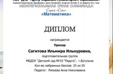 Поздравляем воспитанницу подготовительной группы Сагитову Ильмиру, занявшую призовое место в межрегиональной очной олимпиаде по математике, которую провели в СОШ √6 НОУ ДПО «Центр социально-гуманитарного образования».