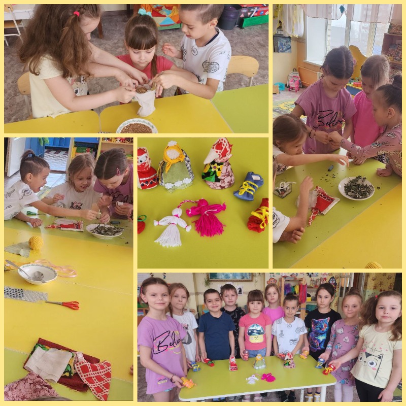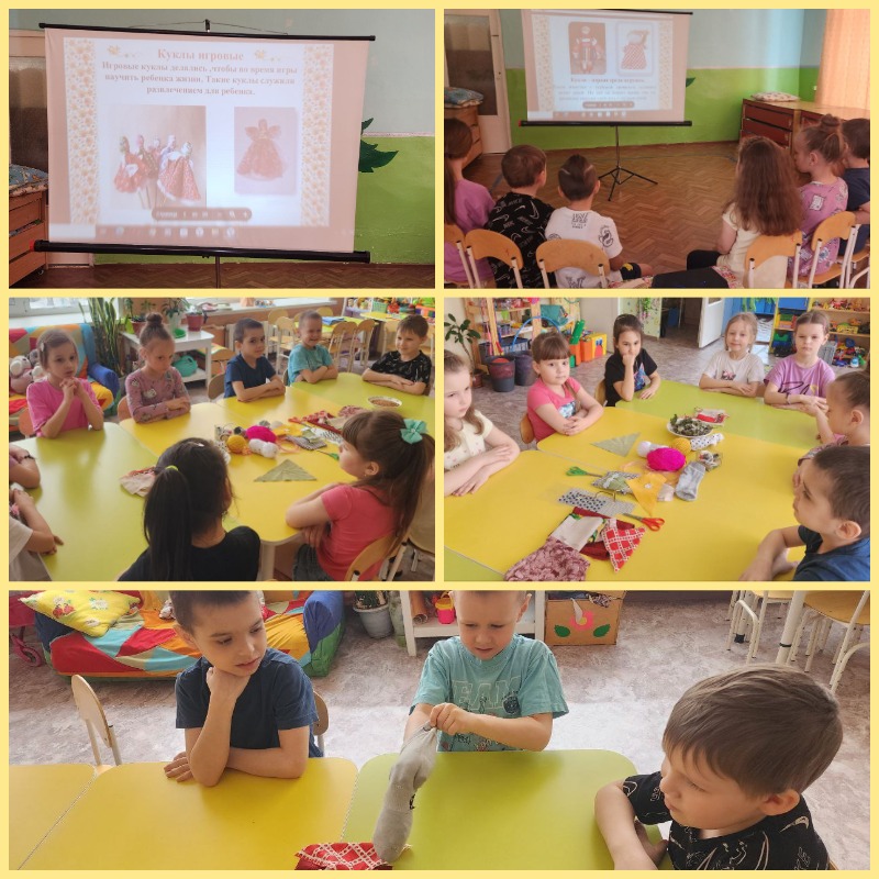 Сегодня воспитанники подготовительной к школе группы "Солнышко" (воспитатели Бородина М.Н., Деркач З.М.) знакомились с историей традиционной русской народной куклы. С большим интересом дети смотрели презентацию и слушали историю. И как они удивились, узнав, что первые куклы были тряпичные, но, тем не менее, они разные и каждая что-то значила. А затем, совместно с воспитателями, ребята изготовили своих тряпичных кукол, а именно: "Сорока", "Кубышка-Травница", "Зерновушка-Крупеничка", "Пеленашка".