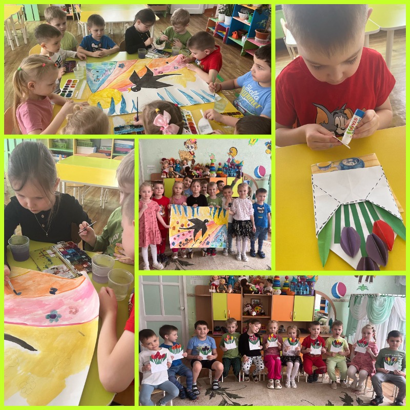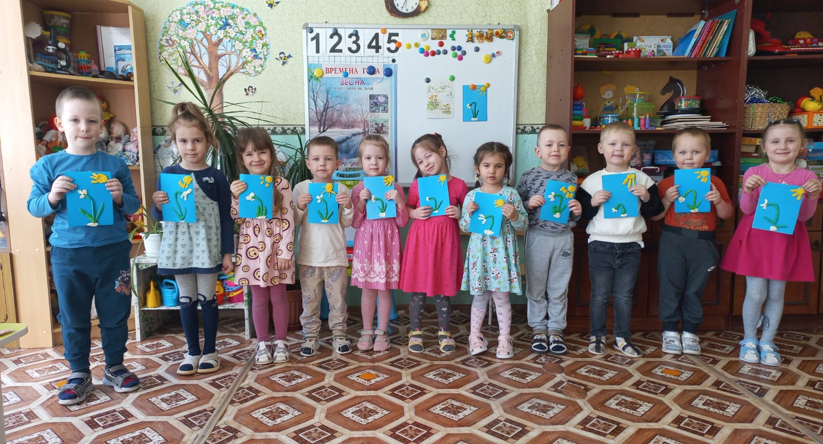 Ребята старшей группы «Звёздочки» (воспитатели: Тихонова К.Б., Юрченко К.М.) закрепляли представления о весне, сезонных изменениях в природе, одежде людей: солнце светит ярко, солнышко просыпается рано — дни становятся длиннее. Во время тематических бесед продолжаем расширять знания о особенностях поведения животных и птиц весной. Читаем произведения о весне, слушаем музыкальные произведения, рассматриваем иллюстрации и картины. Через художественное творчество вспомнили название первых весенних цветов. Ребята занимались коллективным рисованием и делали весеннюю аппликацию.