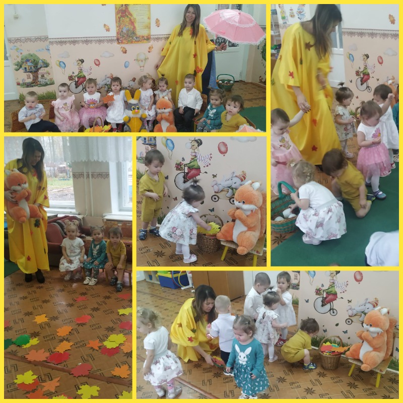 К нашим самым маленьким воспитанникам в гости пришли весёлые  зверюшки: пушистая Белочка и озорной Зайчик. Дети окунулись в сказку и с  удовольствием помогали Белочке запасать грибы на зиму, весело прыгали с Зайчиком по разноцветным дорожкам, и собрали полную корзину осенних листочков, чтобы в их домиках было тепло и уютно.