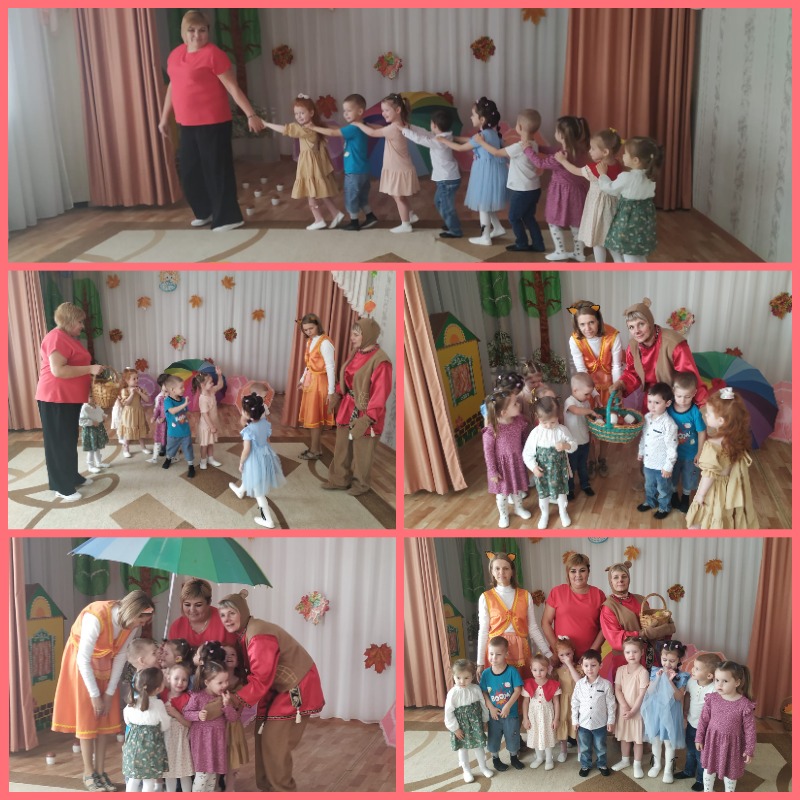 27.10.2025 г. В группе "Капельки" прошло осеннее развлечение с участием Машеньки и Медведя. Вместе с ними наши малыши танцевали с осенними листочками, дружно пели песенку про Осень, играли в свою любимую игру "У медведя во бору", веселились и радовались от души, а когда налетела тучка, спрятались под большим, ярким зонтиком.