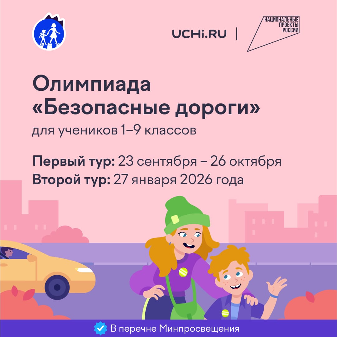 На Учи.ру 23 сентября — 26 октября для дошкольников и учеников 1–9 классов будет проводиться бесплатная всероссийская олимпиада «Безопасные дороги». Организаторами являются Минтранс России, ГУОБДД МВД России, Минпросвещения России, АНО «Национальные приоритеты», Учи.ру при поддержке национального проекта «Инфраструктура для жизни». Олимпиада входит в проект приказа перечня олимпиад Минпросвещения на 2025/26 учебный год. Соревнование направлено на: