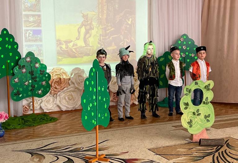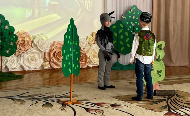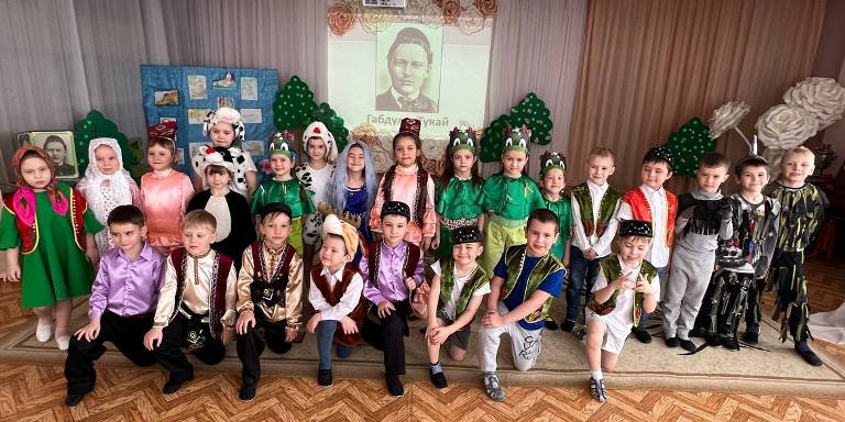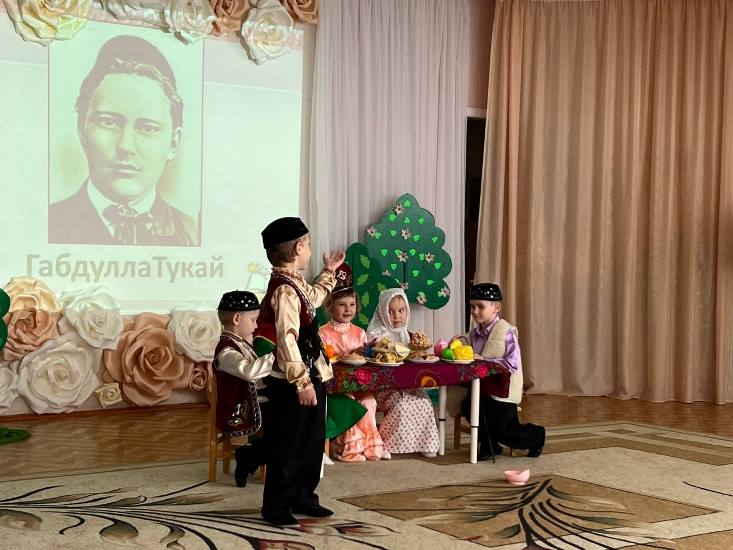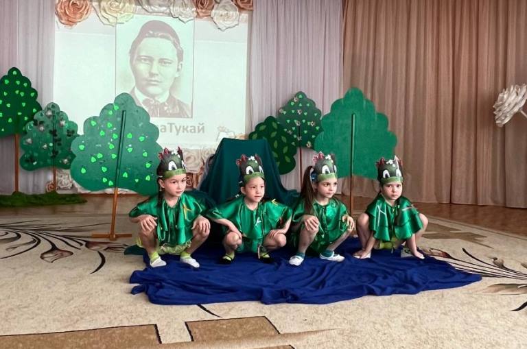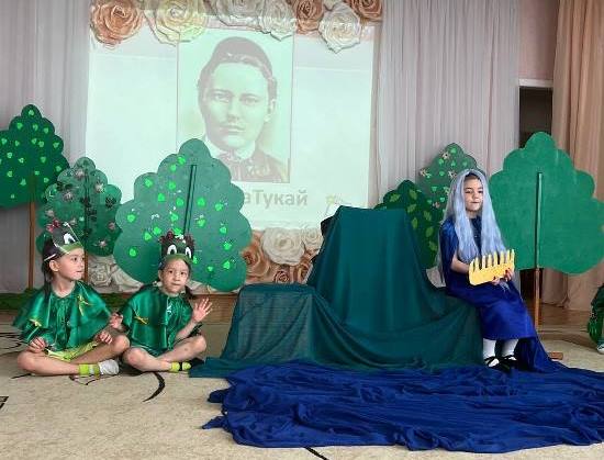 Опубликовано: 26.04.2023Әгәр дә, балалар үзләре үк бу әсәрләрне сәхнәләштереп уйнасалар, бу икеләтә отышлы. Бездә быел Тукай бәйрәме шул юнәлештә үтте. Мәктәпкә әзерлек һәм зурлар төркеме тәрбияләнүчеләре тамашачыларга Тукайның «Кызыклы шәкерт», «Бала белән Күбәләк», «Бу кайсы вакыт?», «Безнең гаилә» шигырьләрен һәм «Су анасы», «Шүрәле» әкиятләрен күрсәттеләр. Бу чыгышлар, шул ук әсәрләргә төшерелгән мультфильмнар белән ныгытылып барды. «Тукай әсәрләре буенча мультсәяхәт» тамашасы «Туган тел» җырын җырлап тәмамланды.