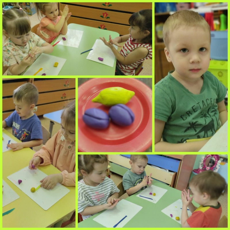Дети учились лепить предметы округлой формы, разных по величине и цвету; активизировали освоенные способы лепки (раскатывание шара, оттягивание, защипывание, умение работать со стекой).