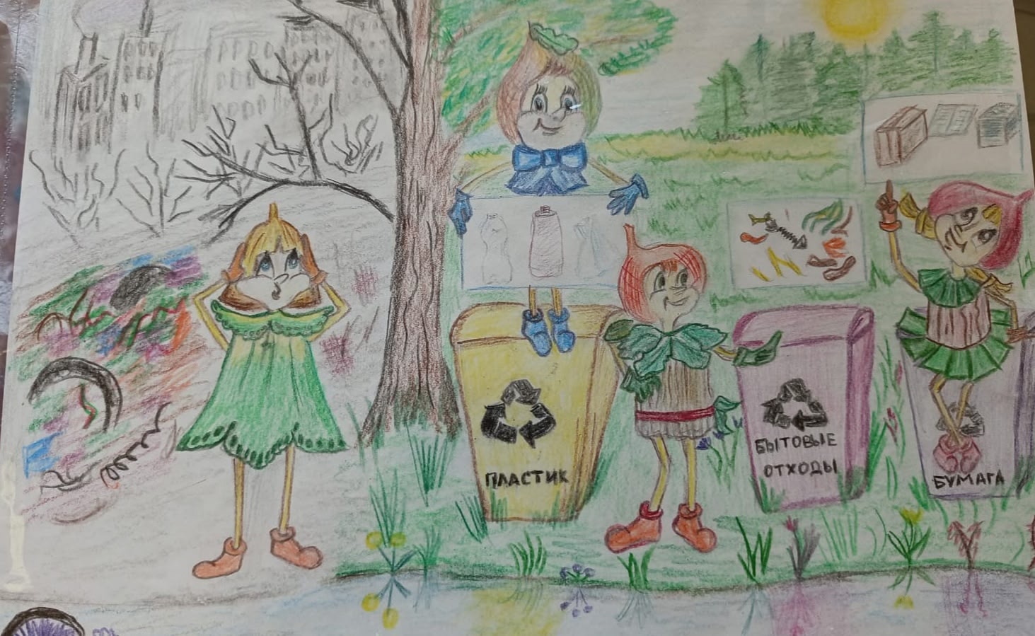 На рисунке изображена сцена, посвящённая защите окружающей среды и раздельному сбору мусора.