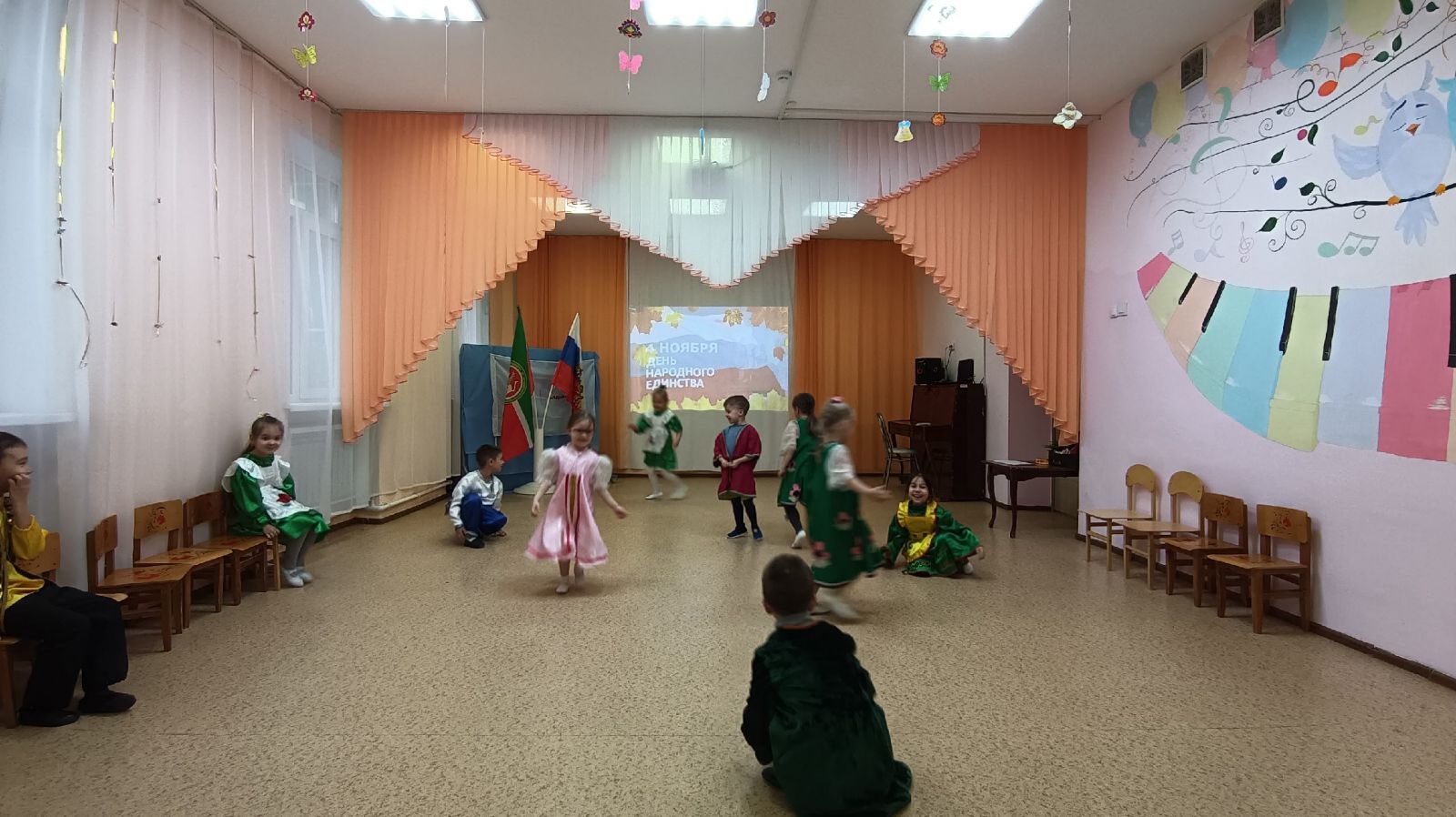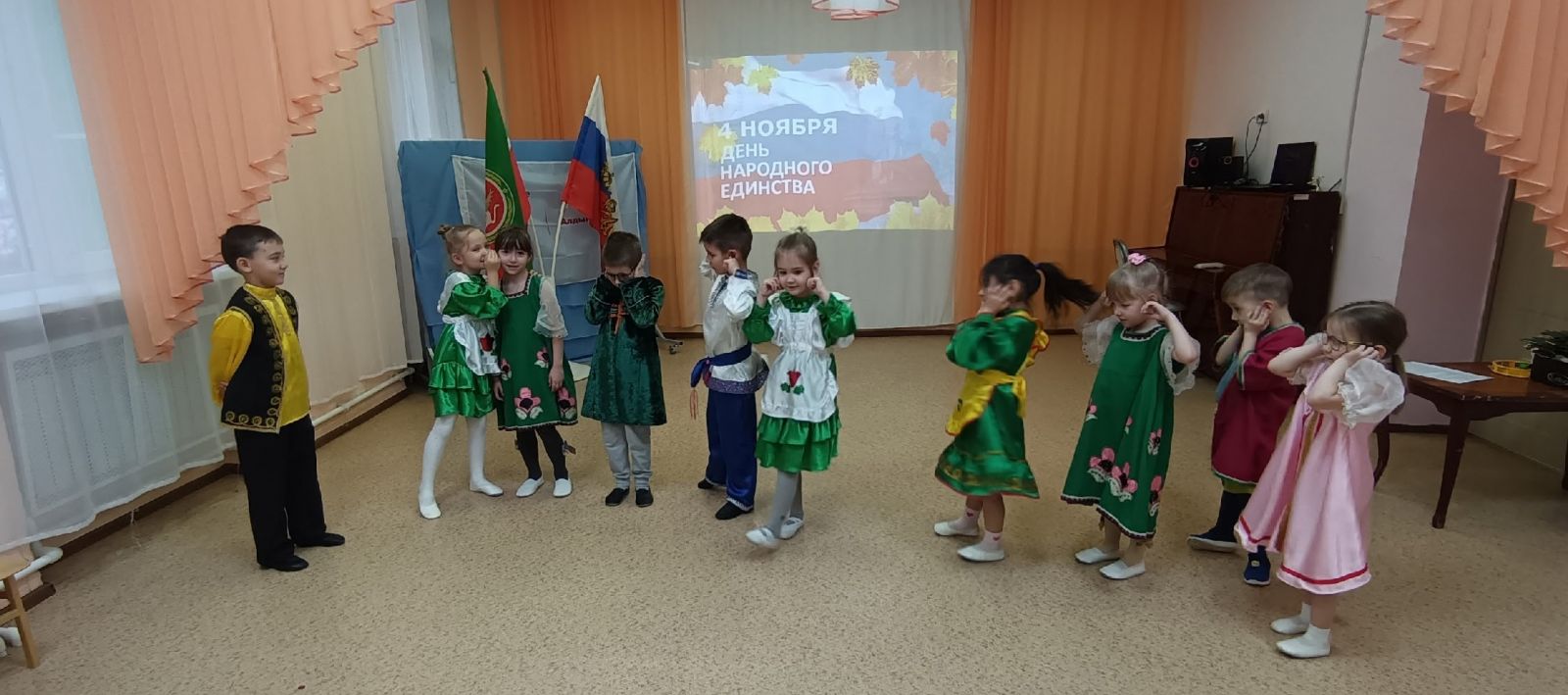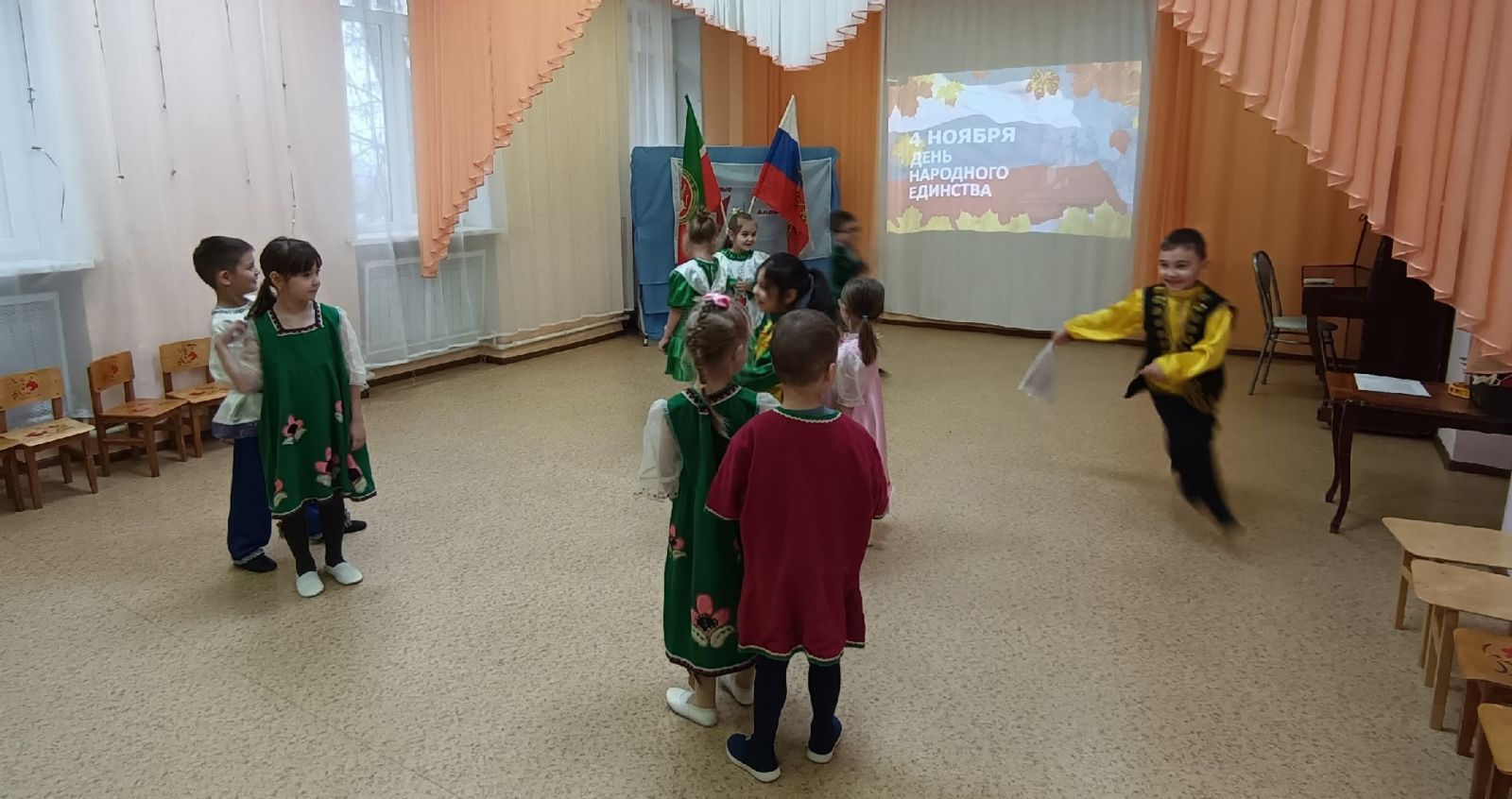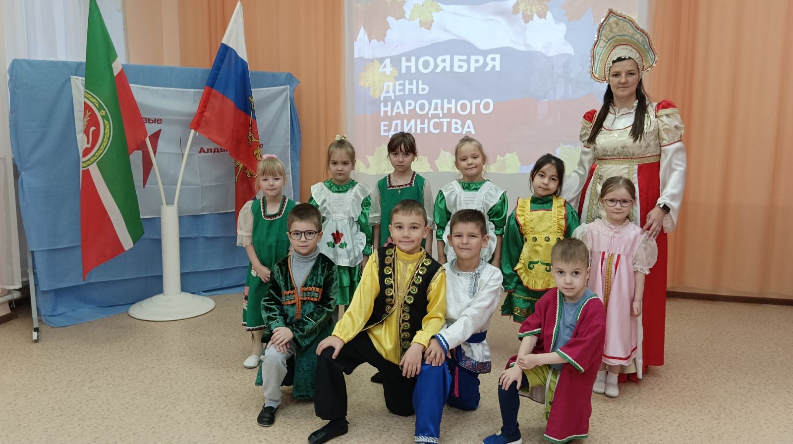 31.10.2025 г. День народного единства — это праздник, с которым дети должны быть знакомы ещё с раннего возраста. С воспитанниками первой младшей группы "Кояшкай" было проведено мероприятие, посвящённое этому дню. Целью мероприятия было знакомство детей с праздником "День народного единства".