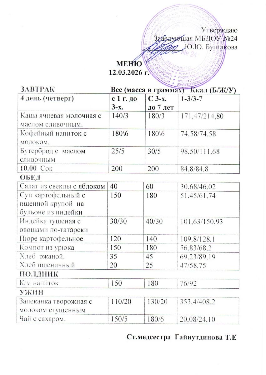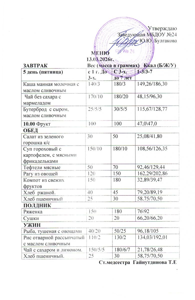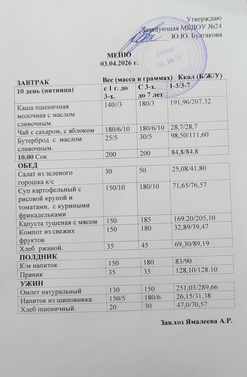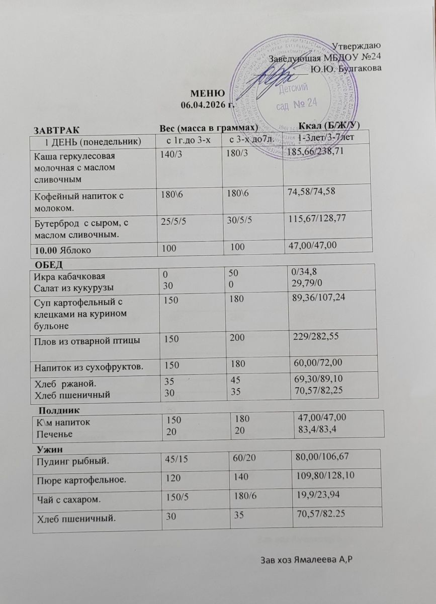 Питание осуществляется в соответствии с меню, утверждённым Заведующей Учреждением и старшей медицинской сестрой. Режим и кратность питания воспитанников и обучающихся устанавливаются в соответствии с деятельностью их пребывания в Учреждении и рекомендациями органов здравоохранения.