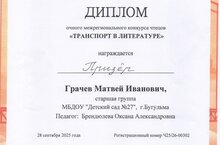28 сентября состоялся очный межрегиональный конкурс чтецов "Транспорт в литературе", который был организован на базе МБОУ средней общеобразовательной школы № 6 с углубленным изучением отдельных предметов. ПРИЗЁРОМ конкурса стал воспитанник старшей группы № 1 Грачёв Матвей. Поздравляем Матвея и желаем не останавливаться на достигнутом, всегда двигаться вперед, покорять любые вершины. Пусть на пути к успеху всегда светит счастливая звезда!
