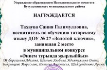 Поздравляем воспитателя татарского языка Тахауву Санию Галимулловну и детский коллектив (Мубаракшину Аделину, Шагееву Альбину, Идиятуллину Диану, Бояринцеву Мираславу, Пятаеву Анастасию, Шайхутдинову Арину) занявших 2 место в муниципальном музыкальном конкурсе «Әнием турында җырлыйбыз» - «Поём о маме», посвященного Международному женскому дню «8 марта» среди дошкольных образовательных учреждений Бугульминского муниципального района Республики Татарстан организованного в рамках ММО воспитателей по обучению детей татарскому языку. Цель конкурса - приобщение педагогов и воспитанников к вокальному творчеству, посредством национального репертуара добиваясь чистоты звучания, правильного произношения музыкально выразительного пения.