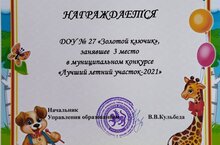 Лето – любимая и долгожданная пора, с наступлением которой дети в детском саду все больше времени проводят на участке. Поэтому развивающая среда участка должна обеспечить максимальный психологический комфорт для каждого ребенка, создать возможности для реализации его права на свободный выбор вида деятельности и реализацию двигательной активности. Педагоги дошкольного учреждения с помощью родителей приложили усилия для создания соответствующей развивающей среды на игровой площадке. Педагоги представили комиссии свои осуществлённые проекты по благоустройству игровых участков, с учётом организации условий для физического развития, оздоровления, охраны жизни и здоровья детей. Комиссия отметила большую подготовку педагогов и родителей к организации летней оздоровительной компании. И по итогу конкурса наш детский сад занял почетное 3 место. Ура!!!!!