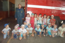 С целью углубления и расширения знаний детей о причинах возникновения пожаров, о работе пожарных, о технике, помогающей тушить пожары, а также в обучении детей тому, как правильно вести себя во время пожара, умении вовремя распознать опасность и принять меры предосторожности сегодня была организована экскурсия в пожарную часть.