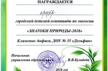 Наша воспитанница стала призёром городской детской олимпиады по экологии "Знатоки природы - 2018".