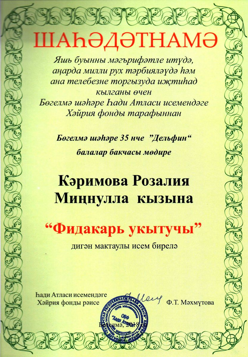 Опубликовано: 17.02.2018Поздравляем нашего руководителя - заведующую Каримову Розалию Миннуловну с почётным званием "Фидакарь укытучы" фонда Х.Атласи.