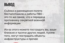 Не выкладывайте фото и видео воздушных целей и работы систем ПВО в мессенджеры и соцсети, особенно с привязкой к местности (характерными ориентирами).