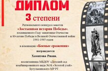 Поздравляем Хамитову Рианну, воспитанницу старшей татарской группы № 10 (педагог Петухова Е.А.) с победой в Региональном конкурсе макетов «Застывшая история Победы» в номинации "Боевые сражения". Пусть всегда горит энтузиазм в глазах, и раскрываются возможности. Вперед, к новым победам!10 нчы татар өлкән төркеме тәрбияләнүчесе Хәмитова Рианнаны (педагогы Петухова Е.А.) «Җиңүнең катып калган тарихы» төбәк макетлар конкурсында "Сугышчан сугышлар" номинациясендә җиңүе белән котлыйбыз. Күзләрдә һәрвакыт энтузиазм янсын, һәм мөмкинлекләр ачылсын. Алга, яңа җиңүләргә!