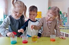 "Фән сәгате". 2 нче логопедия төркеменә әзерлек төркеме укучылары "Бозны ярабыз" дигән тәҗрибә үткәрделәр. Башта суны зәңгәр төскә буяганнар, аннары өстенә сибем салганнар, мамык таяк очына сыек сабын сөрткәннәр һәм суга кагылганнар. Боз ярылган!