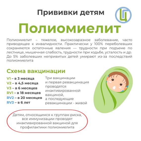Если ваш ребенок по какой-то причине не привит от полиомиелита в соответствии с возрастом, обязательно сделайте прививку в ближайшее время! Вакцинироваться можно в поликлинике по месту жительства абсолютно бесплатно и безопасно. -