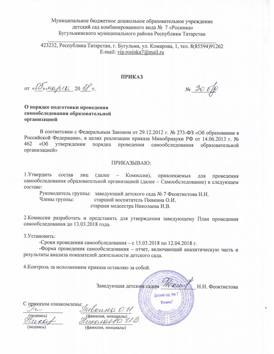 Приказ о порядке подготовки проведения самообследования образовательной организацией за 2017 г.